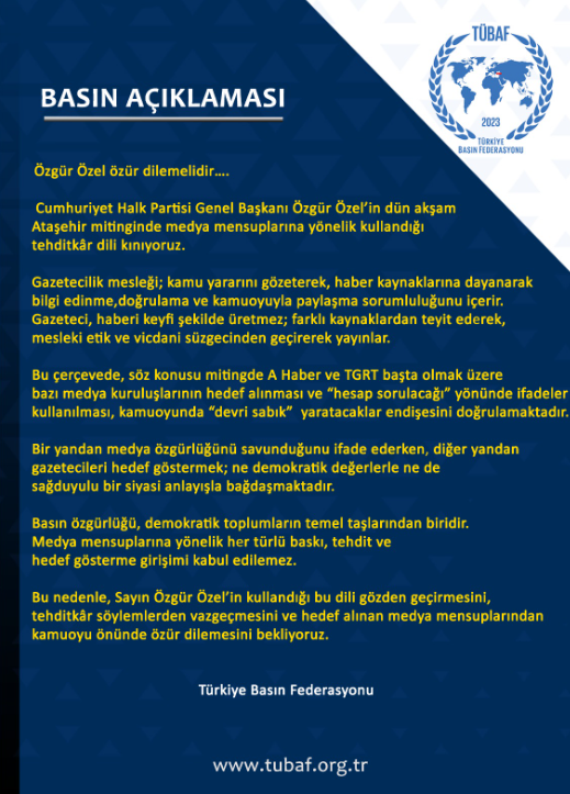 Türkiye Basın Federasyonu’nun Cumhuriyet Halk Partisi (CHP) Genel Başkanı Özgür Özel’in bazı medya kuruluşlarına söylediği sözler üzerine yaptığı açıklamada, gazetecilik mesleğinin kamu yararı doğrultusunda haber alma, doğrulama ve kamuoyunu bilgilendirme sorumluluğu taşıdığı vurgulanırken, medya mensuplarının hedef gösterilmesinin kabul edilemez olduğu ifade edildi.