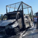 Seyir halindeki kamyonetin lastiği patlayarak alev aldı, araçtan geriye iskeleti kaldı