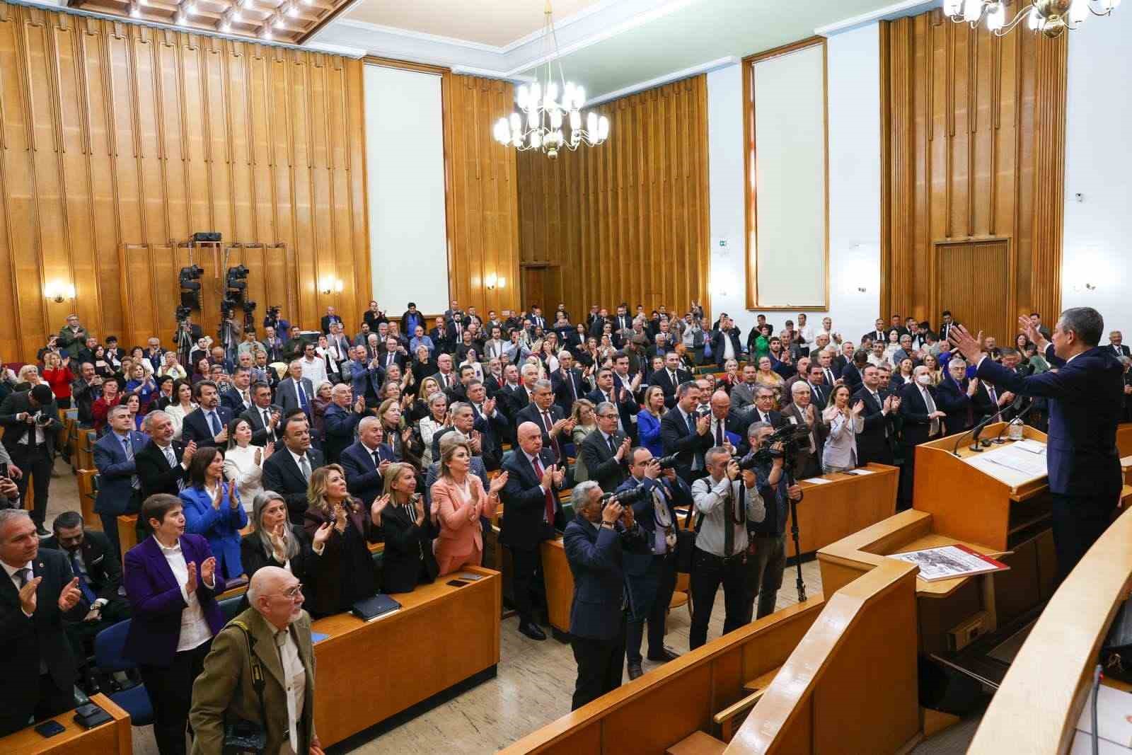 Özel, partisinin TBMM Grup Toplantısında konuştu. Konuşmasında İBB Başkanı Ekrem İmamoğlu’nun tutuklanmasını darbe girişimi olarak değerlendiren Özel, “Türkiye’nin bir sonraki Cumhurbaşkanı’na, Cumhurbaşkanı adayımız Ekrem İmamoğlu’na karşı girişilen darbe girişimini 19 Mart ile 26 Mart arası iki çarşamba arasında, İstanbul Büyükşehir Belediyesi’ni bir kayyıma teslim etmemek için her gece 100 binler, milyonlar olup Saraçhane’de direnenlere teşekkür ediyorum. 23 Mart’ta adayımız tam da sandıkların, oylamanın başlayacağı sırada dört gün gözaltında tutulup, hakim karşısına çıkarılmışken 1 milyon 750 bin üyemizin yüzde 93’ünün sandığa koşmasına. Yetmez; ‘Haberdar et, eşlik et’ sloganıyla konusunu, komşusunu haberdar eden, oy kullanmaya teşvik eden, sandığa kadar eşlik eden bütün üyelerimize teşekkür ediyorum” şeklinde konuştu.