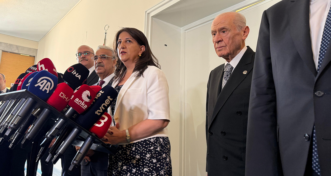 “Bugün önemli bir görüşme daha yaptık. Sabahtan beri yaptığımız görüşmelerin 3’üncüsü. Sayın MHP Genel Başkanı Devlet Bahçeli’ye bizleri kabul ettiği için özellikle teşekkür ediyoruz. Çok olumlu ve verimli bir görüşme gerçekleştirdik. Sürecin geldiği aşama ile ilgili bilgi alışverişinde bulunduk, kendilerini bilgilendirdik. Sayın Bahçeli’nin sürece dair olumlu ve pozitif görüşlerini bir kez daha dinledik. Bu süreçten sonra aşama aşama hem Sayın Bahçeli ile hem de diğer muhalefet partilerinin ve Cumhur İttifakı’nın aktörleriyle görüşmelerimizin devam edeceğini ifade etmek istiyorum. Komisyon aşamasında da birbirimize ihtiyacımız var. İstişareye ihtiyaç var ve ortak bir tutuma ihtiyaç var kanaatini taşıyoruz. Her aşamada hem Sayın Bahçeli’yi hem de diğer partilerin genel başkanlarını bilgilendireceğiz. Bu sürecin bir barış sürecine en kısa zamanda evrilmesi için gereken her türlü desteği ve mücadeleyi vereceğiz.” Bahçeli ise, basın mensuplarının görüşmenin nasıl geçtiği sorusu üzerine, “Ben ahrazım” cevabını verdi.