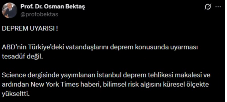 Abd’nin ankara büyükelçiliği, marmara’da olası bir deprem senaryosuna karşı türkiye’de yaşayan abd vatandaşlarını bilgilendiren bir güvenlik duyurusu yayımladı. Sosyal medyada paylaşılan uyarıda “deprem sırasında ne yapılmalı?” Başlığıyla temel önlemler hatırlatıldı. Deprem uzmanı prof. Dr. Osman bektaş, uyarının tesadüf olmadığını belirterek, science dergisinde yayımlanan istanbul deprem tehlikesi çalışması ve new york times’ta çıkan haberlerin küresel risk algısını artırdığını söyledi. Bektaş, söz konusu duyurunun “kesin deprem” anlamına gelmediğini, artan bilimsel risk algısının diplomatik bir yansıması olduğunu vurguladı.