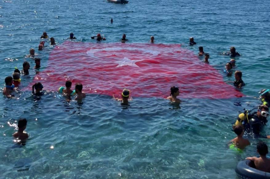 30 Ağustos Zafer Bayramı kutlamaları çerçevesinde yüzücü ve dalgıçlar tarafından denizde dev Türk Bayrağı açıldı.