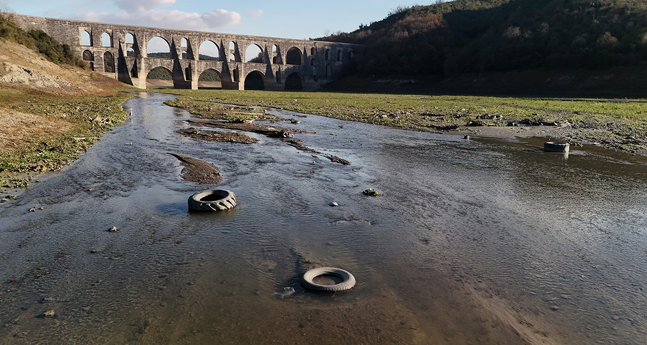 Sıcak yaz aylarının ardından kurak bir sonbahar geçiren İstanbul’da barajlardaki doluluk oranı her geçen gün düşüyor. Mega kentteki barajlarda doluluk oranı İSKİ verilerine göre yüzde 28,13’e geriledi. İstanbul’un en önemli kaynaklarından olan Alibey Barajı’ndaki su seviyesi de düşmeye devam ediyor. Son 10 yılın en düşük su seviyelerini gören Alibey Barajı’ndaki doluluk oranı ise yüzde 9,37 oldu. Alibey Barajında yaşanan kuraklık havadan görüntülendi. Alibey Barajı içerisinde bulunan Kurt Kemeri ve çevresindeki suların çekilmesi sonrası baraja atılan araç lastikleri gün yüzüne çıktı. Barajdaki bazı alanların ise yeşerdiği görüldü.