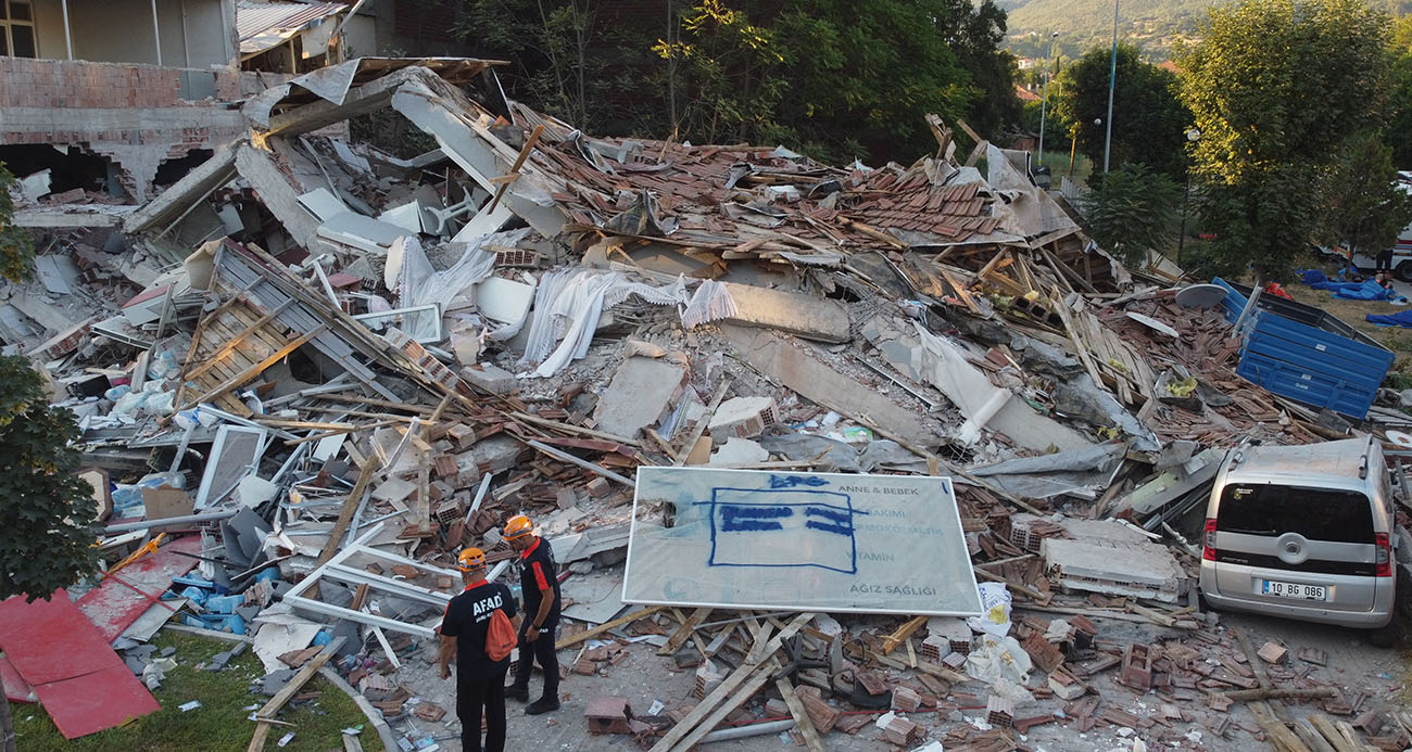 Balıkesir’in Sındırgı ilçesinde yaşanan 6.1 büyüklüğündeki deprem nedeniyle yıkılan bina sabahın ilk ışıklarıyla birlikte dron ile havadan görüntülendi.